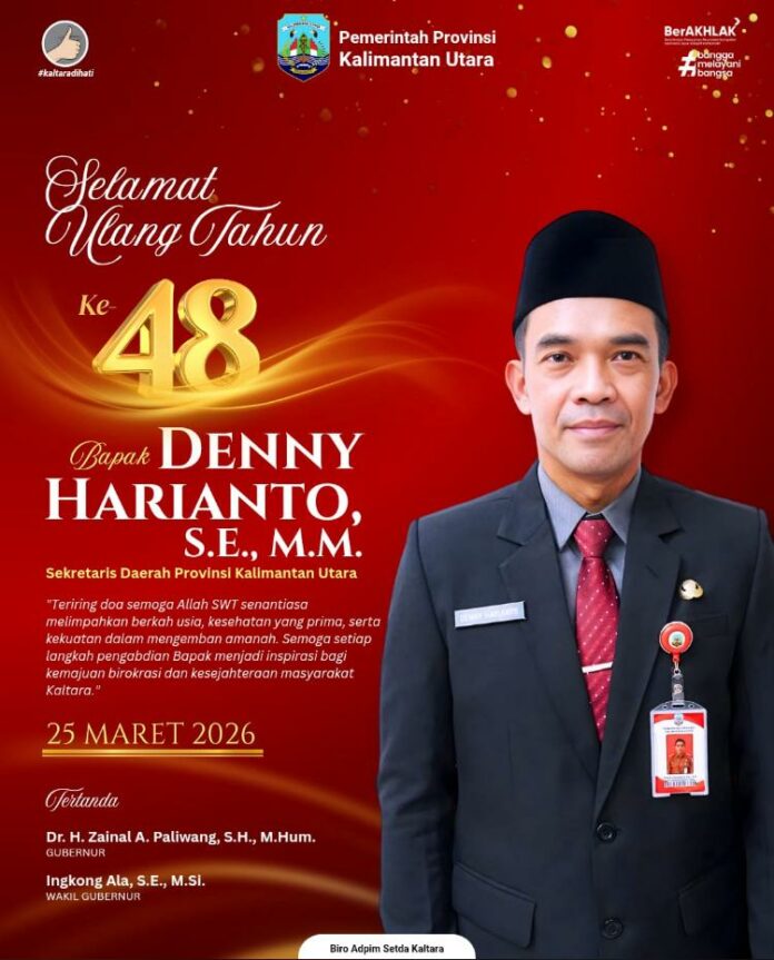 TANJUNG SELOR – Sekretaris Provinsi (Sekprov) Kalimantan Utara, H. Denny Harianto, merayakan hari ulang tahunnya yang ke-48 pada Rabu, 25 Maret. Momentum ini menjadi ajang refleksi sekaligus penguatan komitmen dalam menjalankan tugas sebagai abdi negara dan pelayan masyarakat di Bumi Benuanta.