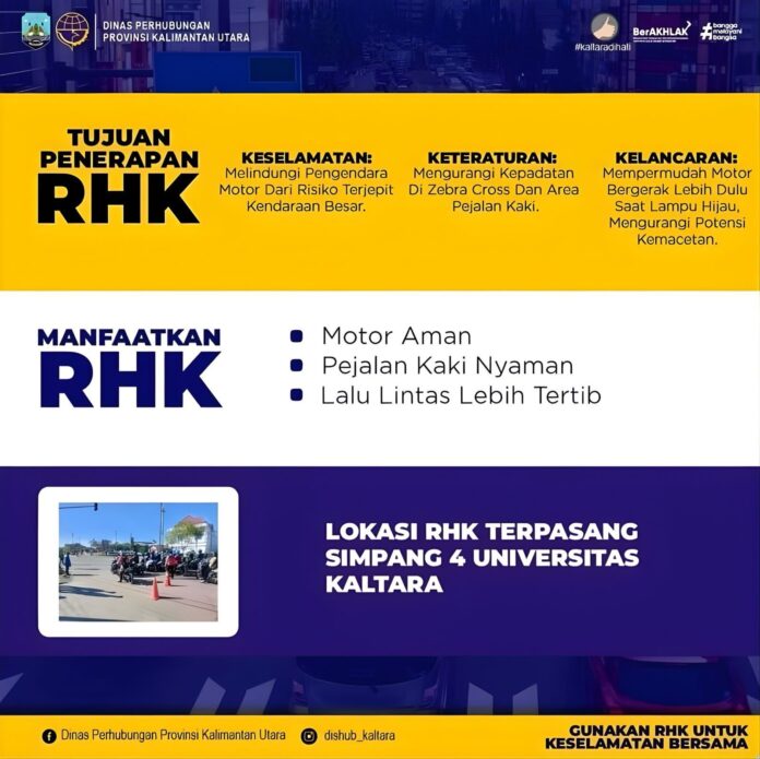 WARTA, TANJUNG SELOR — Dinas Perhubungan (Dishub) Provinsi Kalimantan Utara mengingatkan kembali pentingnya pemanfaatan Ruang Khusus Kendaraan (RHK) bagi pengendara, khususnya roda dua, saat melintas di persimpangan ber-APILL.