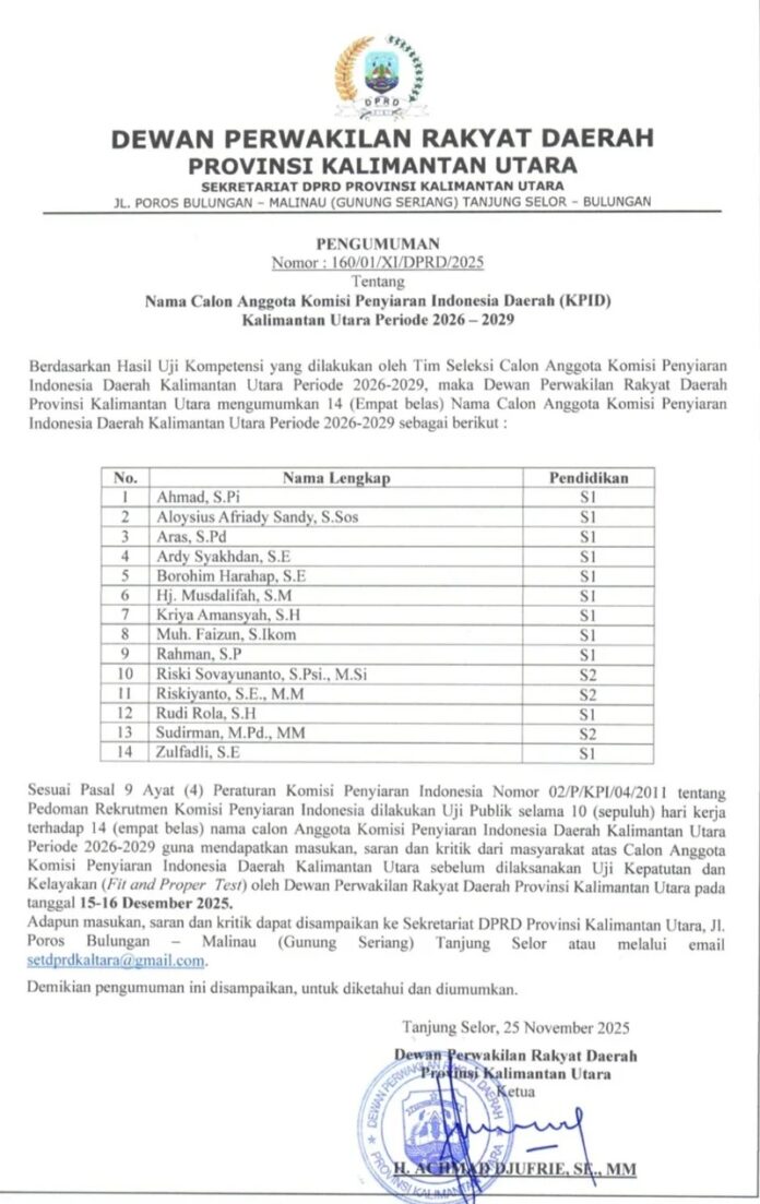 WARTA, TANJUNG SELOR  – Dewan Perwakilan Rakyat Daerah (DPRD) Provinsi Kalimantan Utara resmi membuka ruang partisipasi publik terkait 14 nama calon Anggota Komisi Penyiaran Indonesia Daerah (KPID) Kaltara periode 2026–2029, yang sebelumnya dinyatakan lolos Uji Kompetensi.