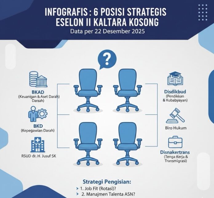 WARTA, TANJUNG SELOR – Gerbong mutasi di lingkungan Pemerintah Provinsi (Pemprov) Kalimantan Utara (Kaltara) menyisakan pekerjaan rumah yang cukup besar. Hingga akhir Desember 2025, tercatat sebanyak enam posisi Jabatan Pimpinan Tinggi (JPT) Pratama atau eselon II kini berstatus kosong tanpa pejabat definitif.