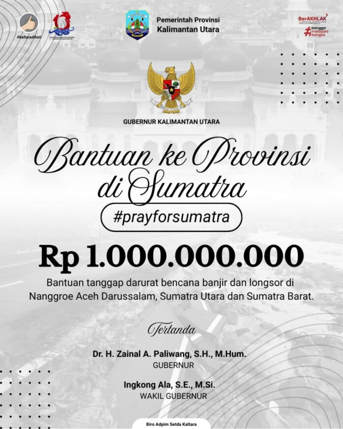 WARTA, TARAKAN – Pemerintah Provinsi Kalimantan Utara (Kaltara) menyalurkan bantuan senilai Rp1 miliar untuk membantu para korban bencana alam di wilayah Sumatra. Bantuan ini diambil dari Anggaran Pendapatan dan Belanja Daerah (APBD) 2025 sebagai bentuk kepedulian terhadap sesama yang sedang terdampak musibah.