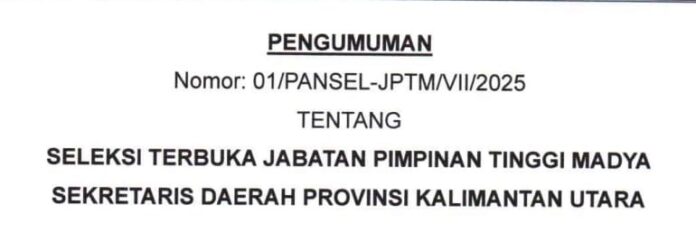 WARTA, TARAKAN – Pemerintah Provinsi Kalimantan Utara resmi membuka seleksi terbuka Jabatan Pimpinan Tinggi Madya Sekretaris Daerah (Sekda) tahun 2025. Pengumuman ini disampaikan melalui Surat Panitia Seleksi Nomor 01/PANSEL-JPTM/VII/2025 yang berlaku mulai 7 Agustus 2025.